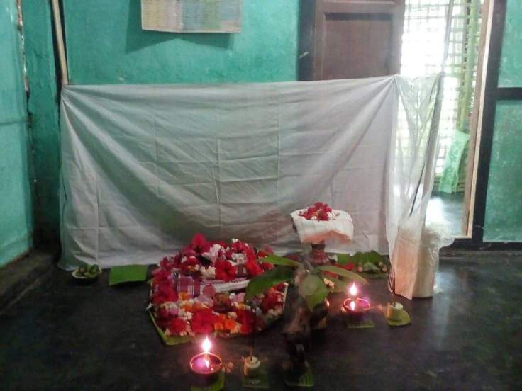 During the third day of the illness, the goddess is given offerings. Three old-aged women known as “Gopinis” are called in by the family for preparing a meal which is served to the ill personThe meal must contain a dish of a sour-flavoured Cat fish curry either preprared using Bamboo shoot or a variety of vegetable called Madulang Tenga. The meal is first offered to the goddess to seek her blessings and is then provided to the person. This special kind of meal is thought to have medicinal qualities which helps in faster recovery.